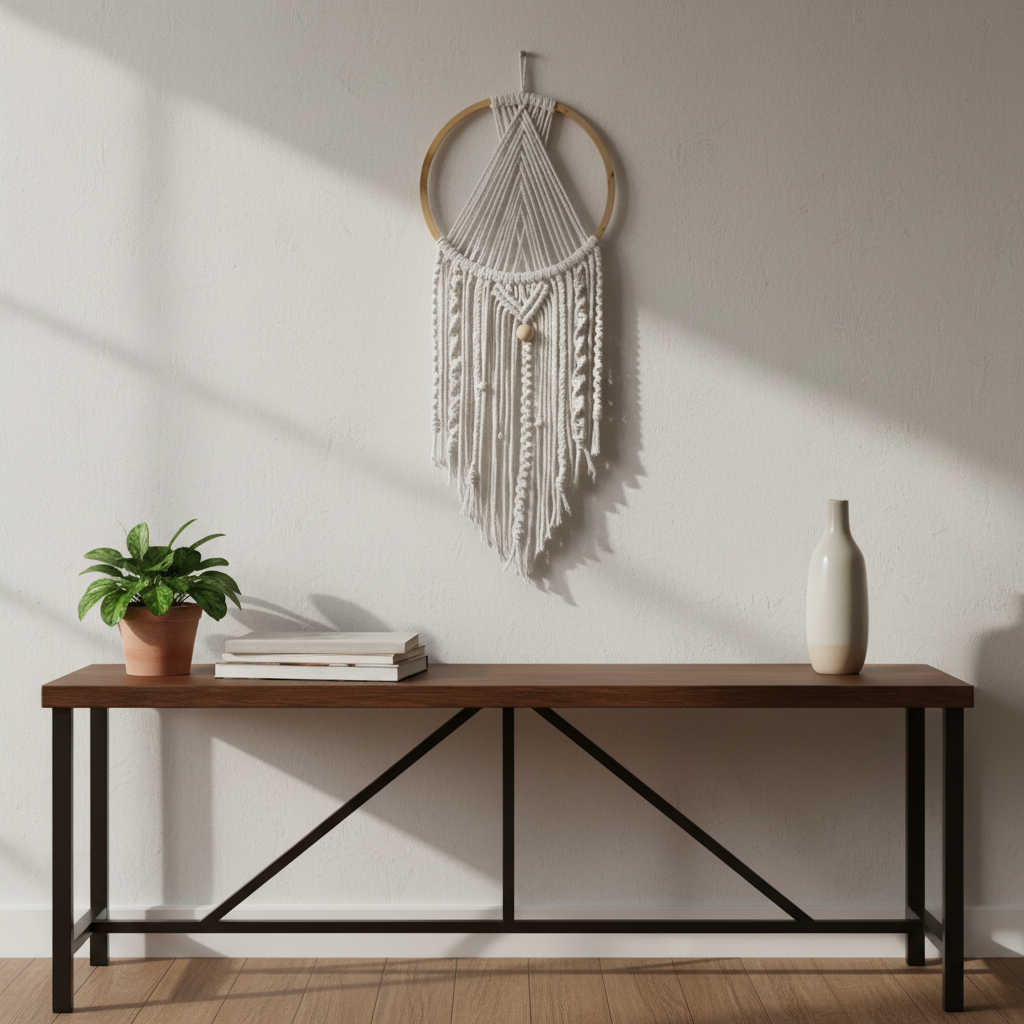 Kaunis käsintehty makramee-seinäkoriste, joka tuo kotiisi lämpöä, luonnollista harmoniaa ja boheemia tunnelmaa. Valmistettu pehmeästä puuvillanarusta ja puisesta renkaasta – täydellinen olohuoneeseen, makuuhuoneeseen tai lahjaksi. Kevyt, tyylikäs ja ajaton.