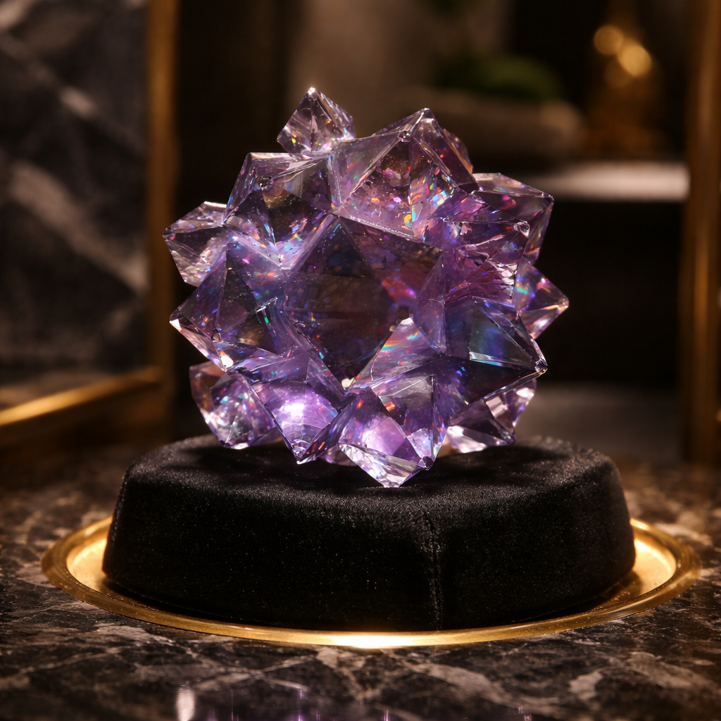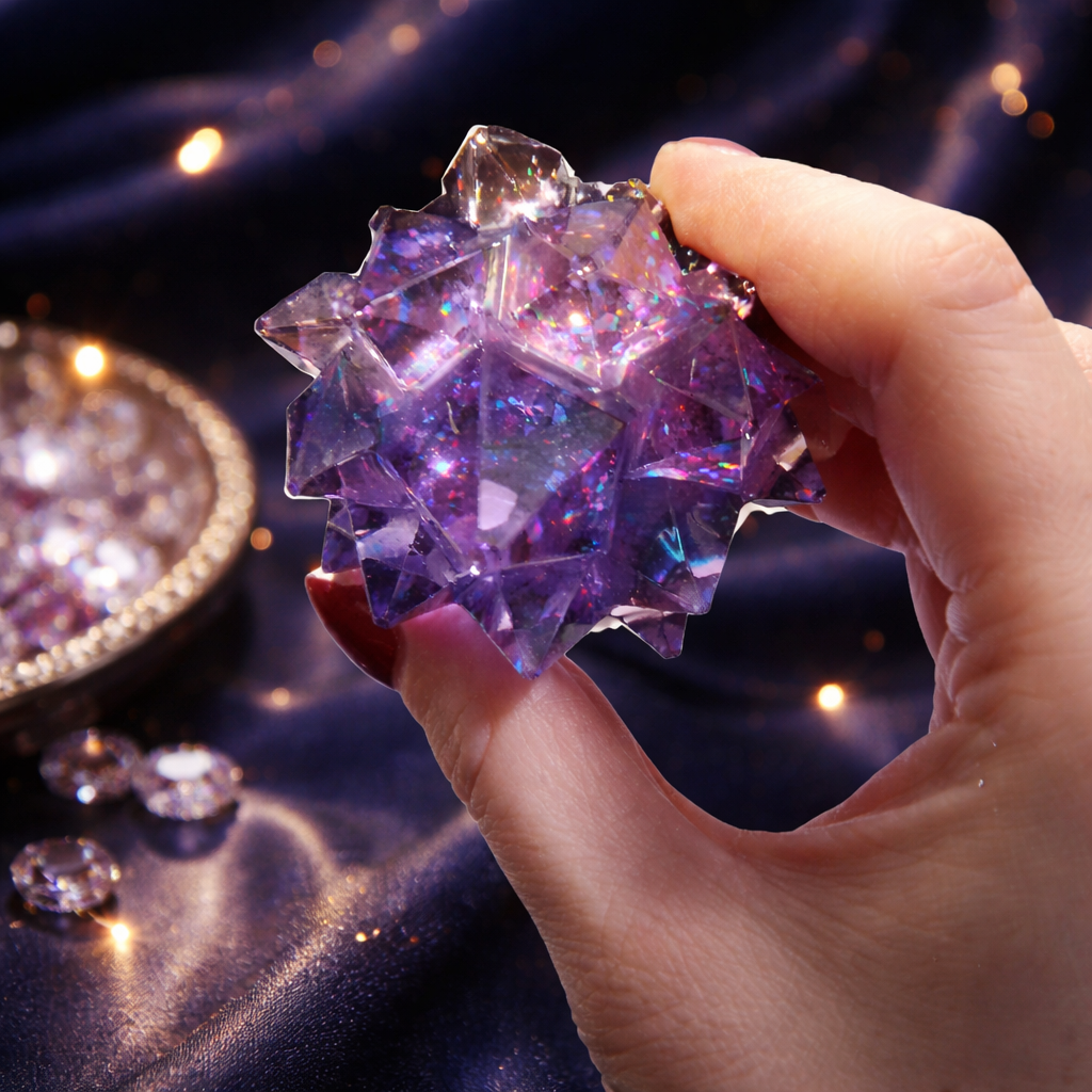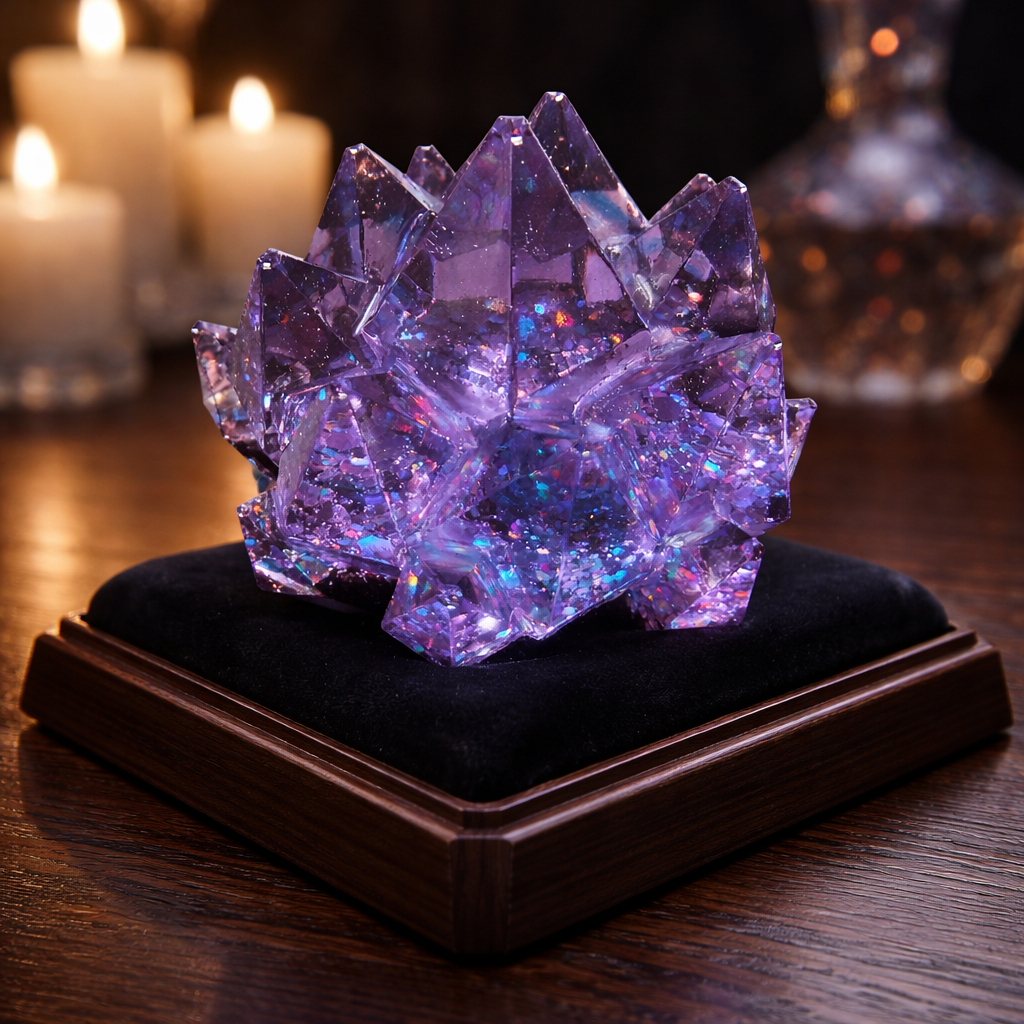 A unique, handmade crystal form crafted from epoxy resin. Approximately 5 cm tall, this decorative piece beautifully captures light, revealing deep violet tones with subtle iridescent reflections. Each piece is one of a kind – a small work of art that adds a touch of mystery and elegance to any space. Perfect as a decorative accent or a meaningful gift.