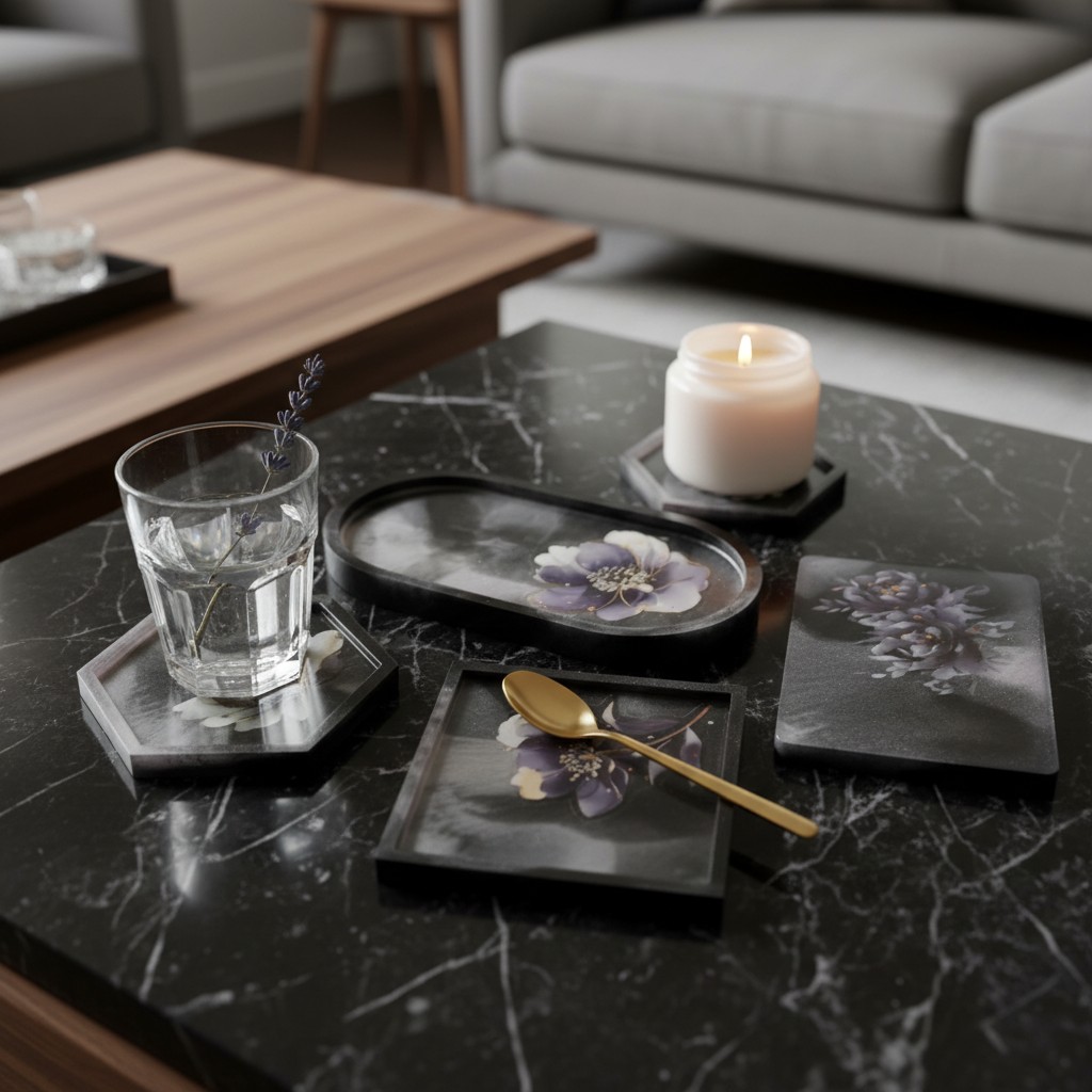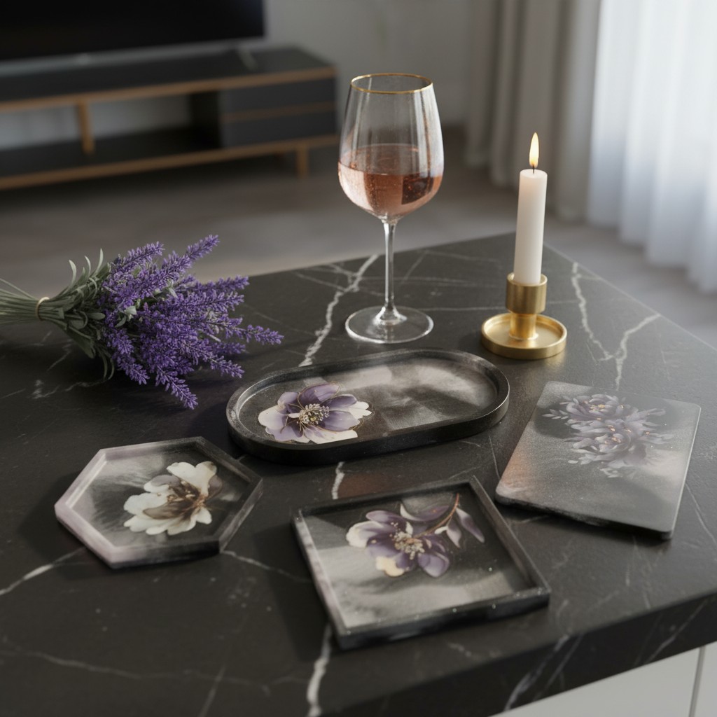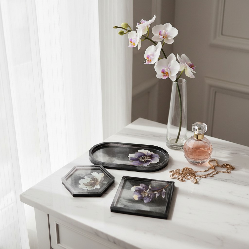Dark Set on ylellinen, käsintehty sisustussetti, valmistettu korkealaatuisesta epoksihartsista. Tummat, kivimäiset sävyt yhdistyvät läpikuultavaan pintaan ja hienovaraisiin kukkakoristeisiin, luoden modernin ja elegantin kokonaisuuden.