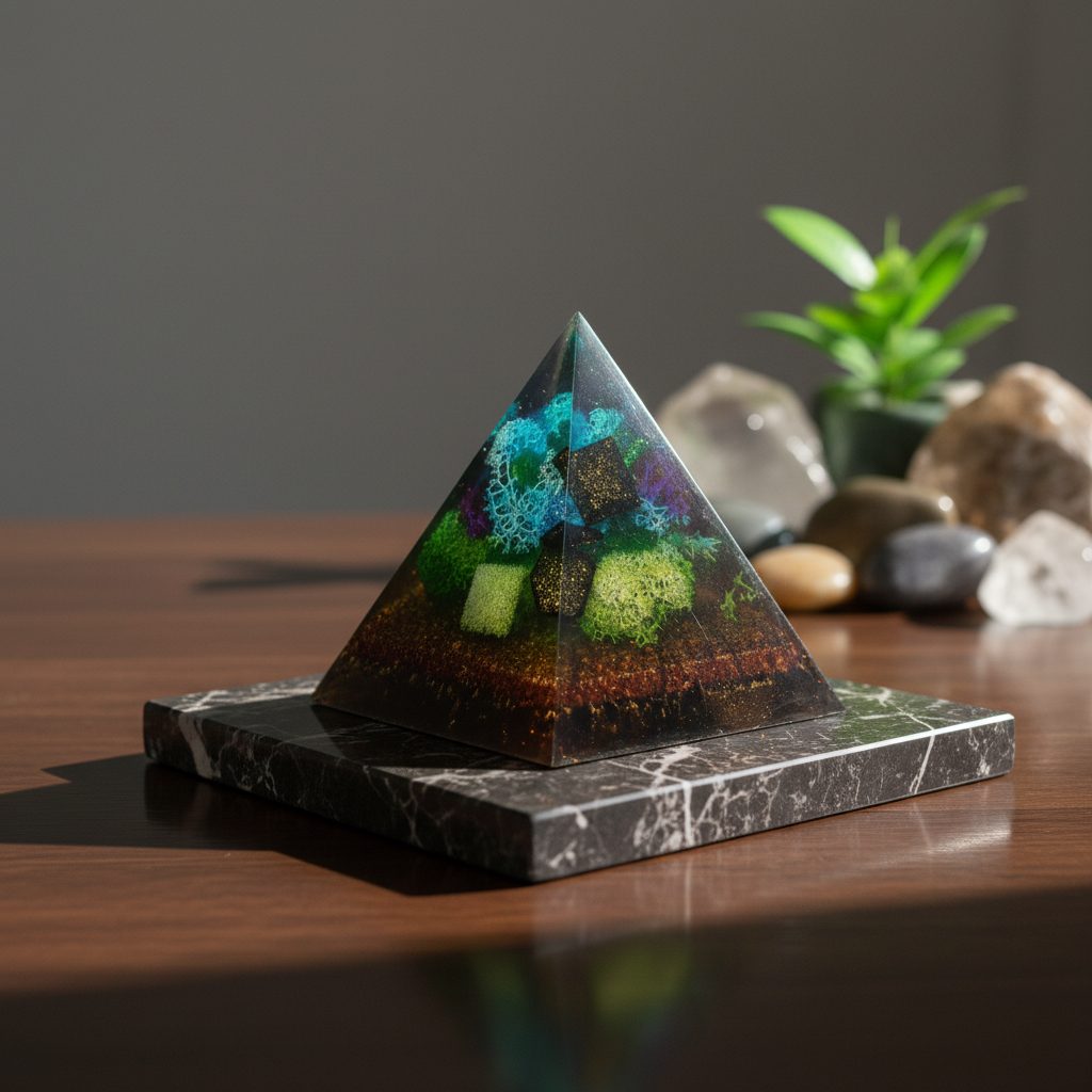 Käsintehty epoksihartsipyramidi, jossa luonto ja magia kohtaavat.