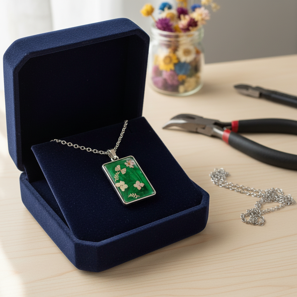 This elegant handmade pendant captures the delicate beauty of nature preserved in durable epoxy resin. Tiny flowers are embedded in a rich green background, creating a unique and timeless accessory. Lightweight, long-lasting, and perfect for everyday wear or as a meaningful gift.