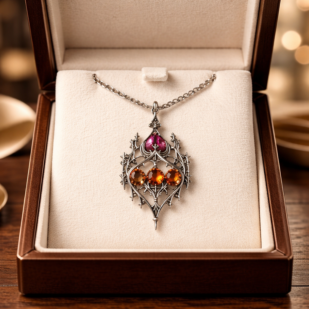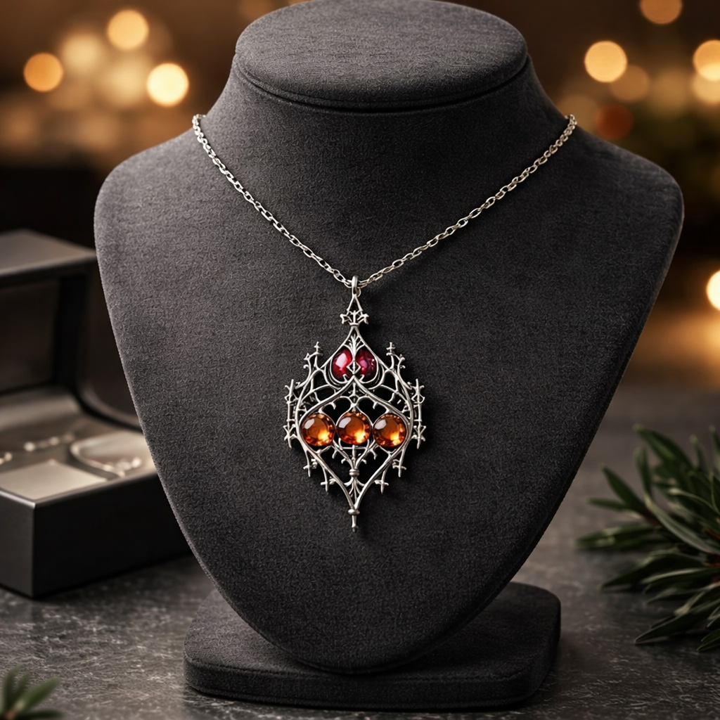 Tämä elegantti ja mystinen riipus on koristeltu kolmella kauniilla granaattikivellä, jotka hehkuvat syvän punaisina lämpimän valon tavoin. Granaatti on tunnettu kivistä, jotka symboloivat voimaa, intohimoa ja elämänenergiaa.