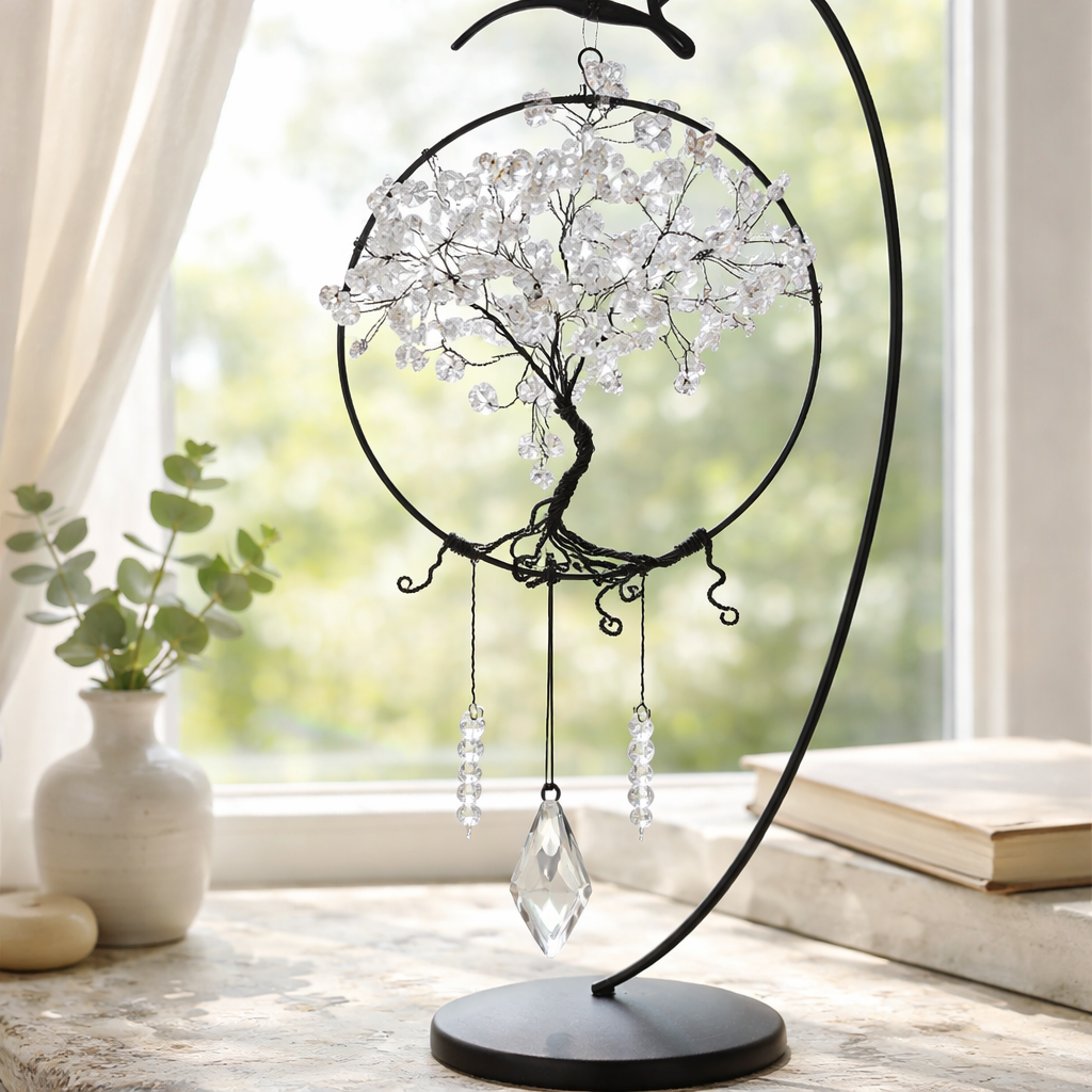 Tämä kaunis käsintehty elämänpuu-koriste yhdistää herkän muotoilun ja kimaltavat yksityiskohdat. Hologrammihelmet heijastavat valoa kauniisti, ja keskellä riippuva kristalli tuo eleganssia ja rauhallista energiaa tilaan.