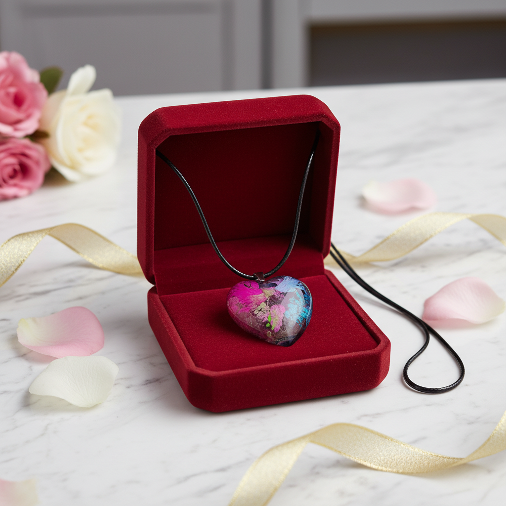 A unique heart-shaped pendant handcrafted from clear epoxy resin and vibrant pigments. Each piece is one of a kind, with flowing colors creating a magical, deep visual effect. Lightweight and comfortable to wear, perfect for everyday use or special occasions. A beautiful gift for someone special or yourself.