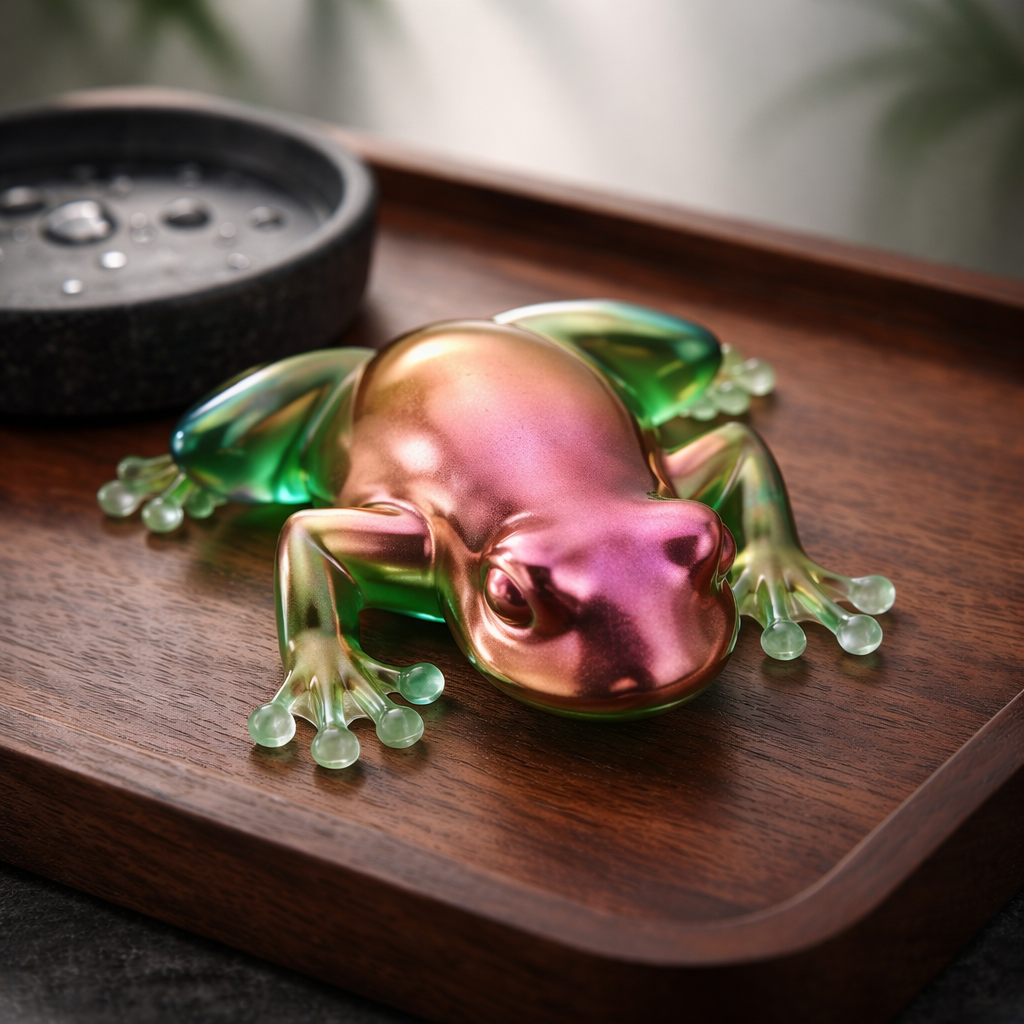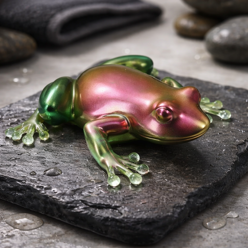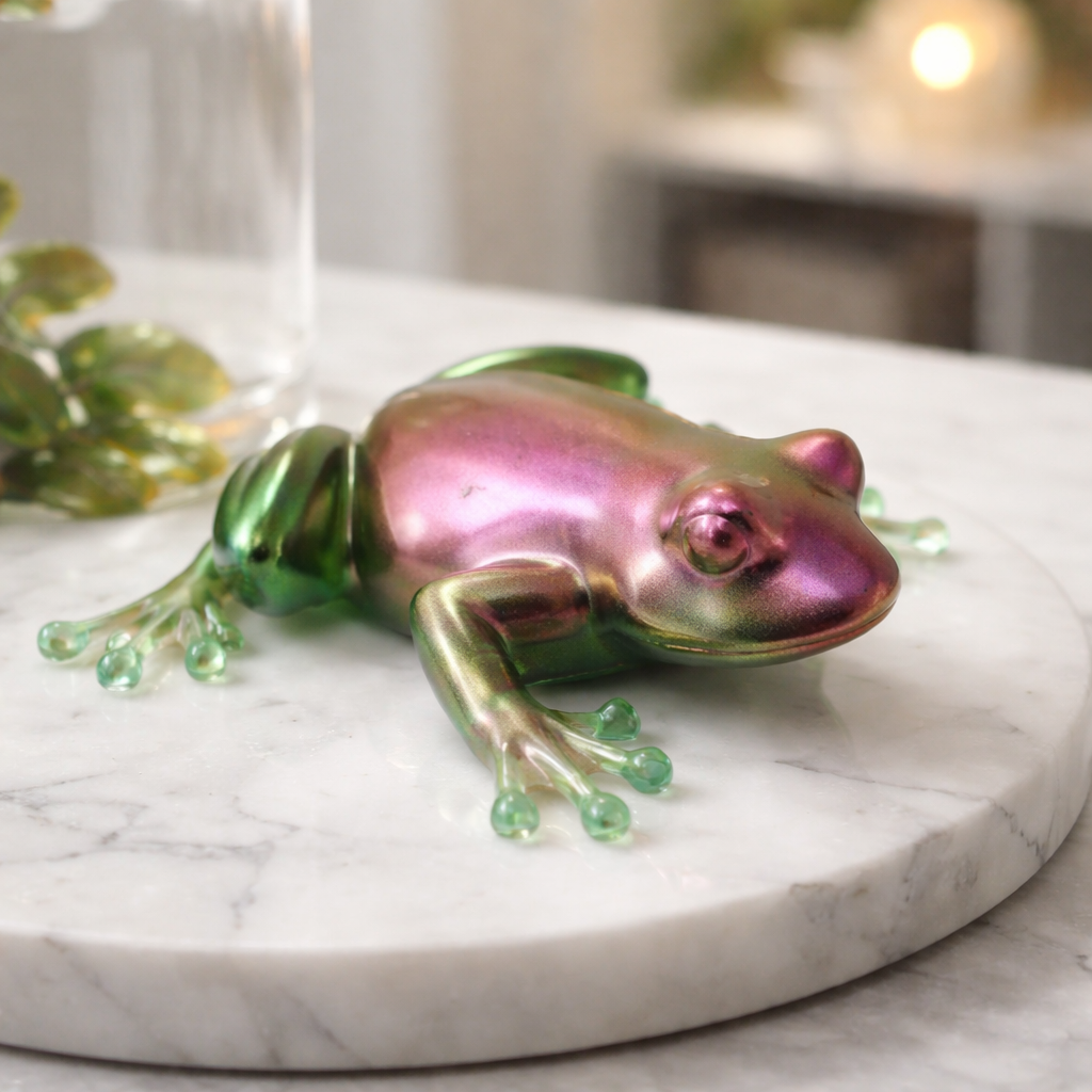 This handmade epoxy resin frog features a stunning color-shifting holographic finish that changes with light – from deep green to gold and rich pink tones.