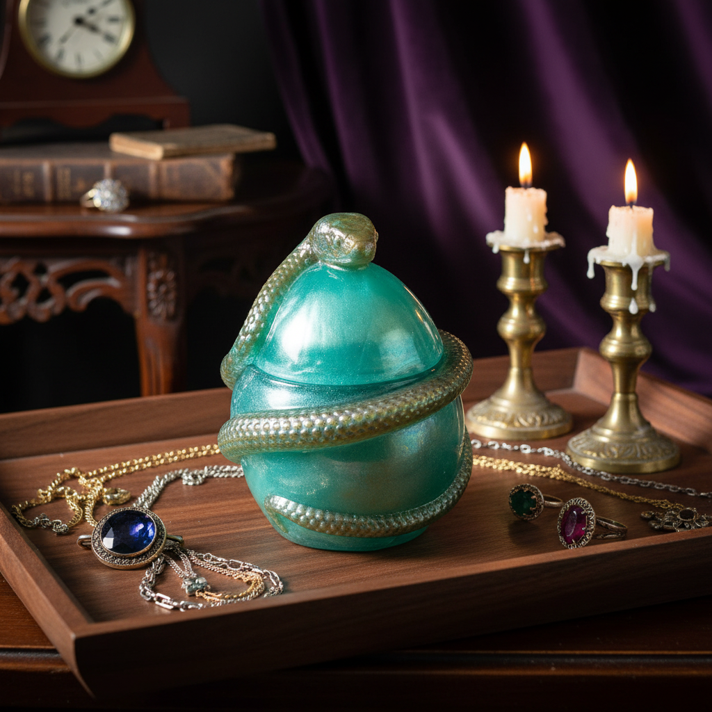 Uniikki epoksista käsin valmistettu rasia, jota koristaa yksityiskohtainen käärmeaihe. Vihreä ja sileä pinta luovat ylellisen ja hieman mystisen ilmeen. Rasia sopii pienille aarteille, koruille, sormuksille tai koristeeksi kotiin. Täydellinen valinta sinulle, joka arvostat käsityötä, symboliikkaa ja persoonallista designia.