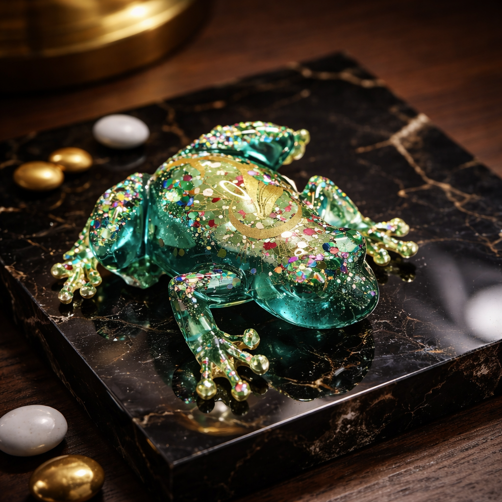 Tämä käsintehty epoksihartsinen sammakko on ainutlaatuinen taide-esine, joka yhdistää luonnon inspiroiman muodon ja hohtavat, kimaltavat yksityiskohdat. Turkoosit sävyt, värikkäät hiutaleet ja symbolinen kuvio tekevät tästä sammakosta katseenvangitsijan.