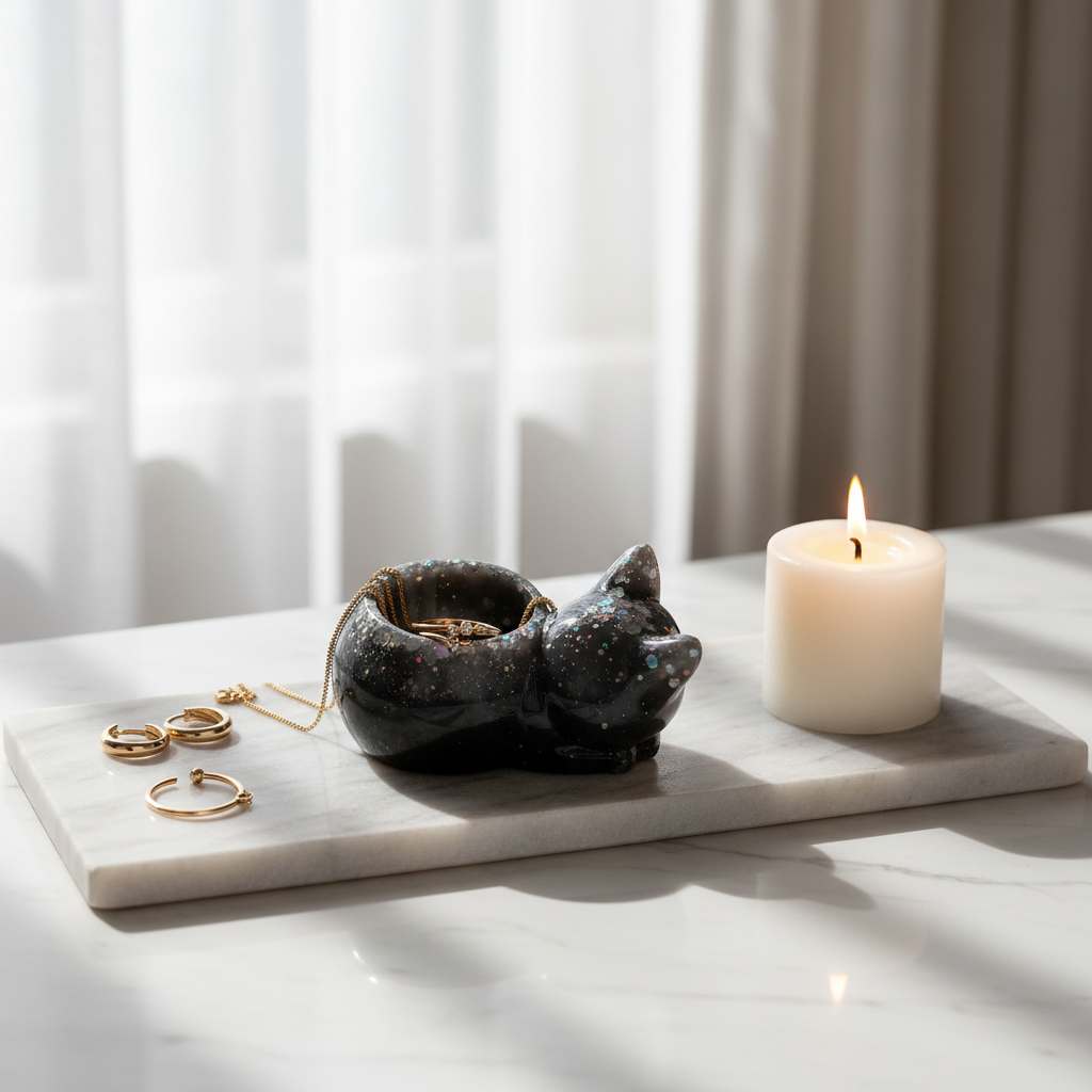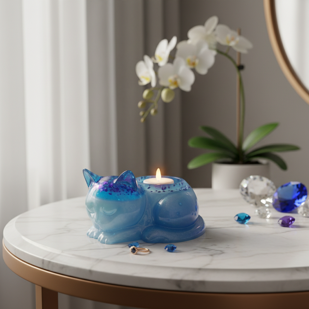 Suloinen käsintehty kissahahmo epoksihartsista toimii pienen kynttilän pidikkeenä tai koristeellisena säilytysastiana.