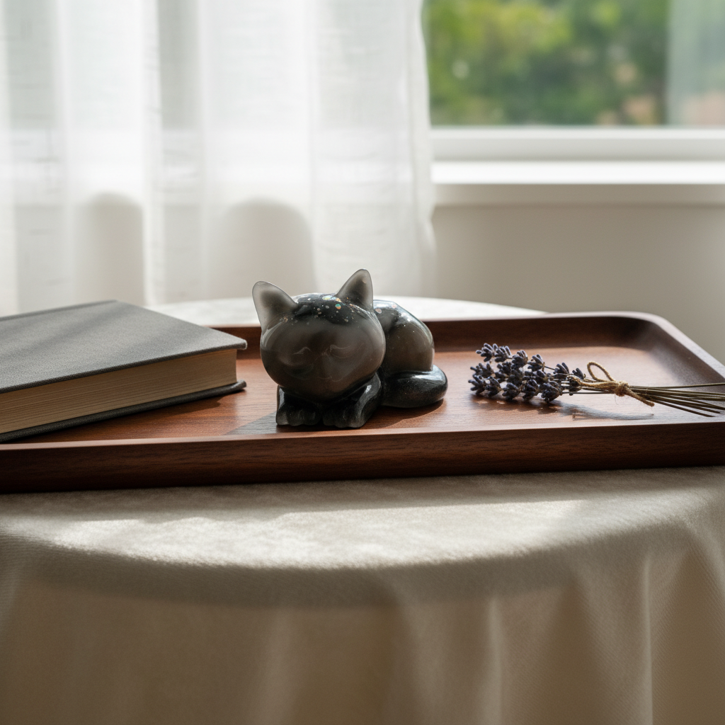 Kiiltävä pinta ja hienovarainen kimallus luovat rauhallisen, lämpimän tunnelman. Täydellinen sisustuselementti kotiin tai lahjaksi kissan ystävälle.