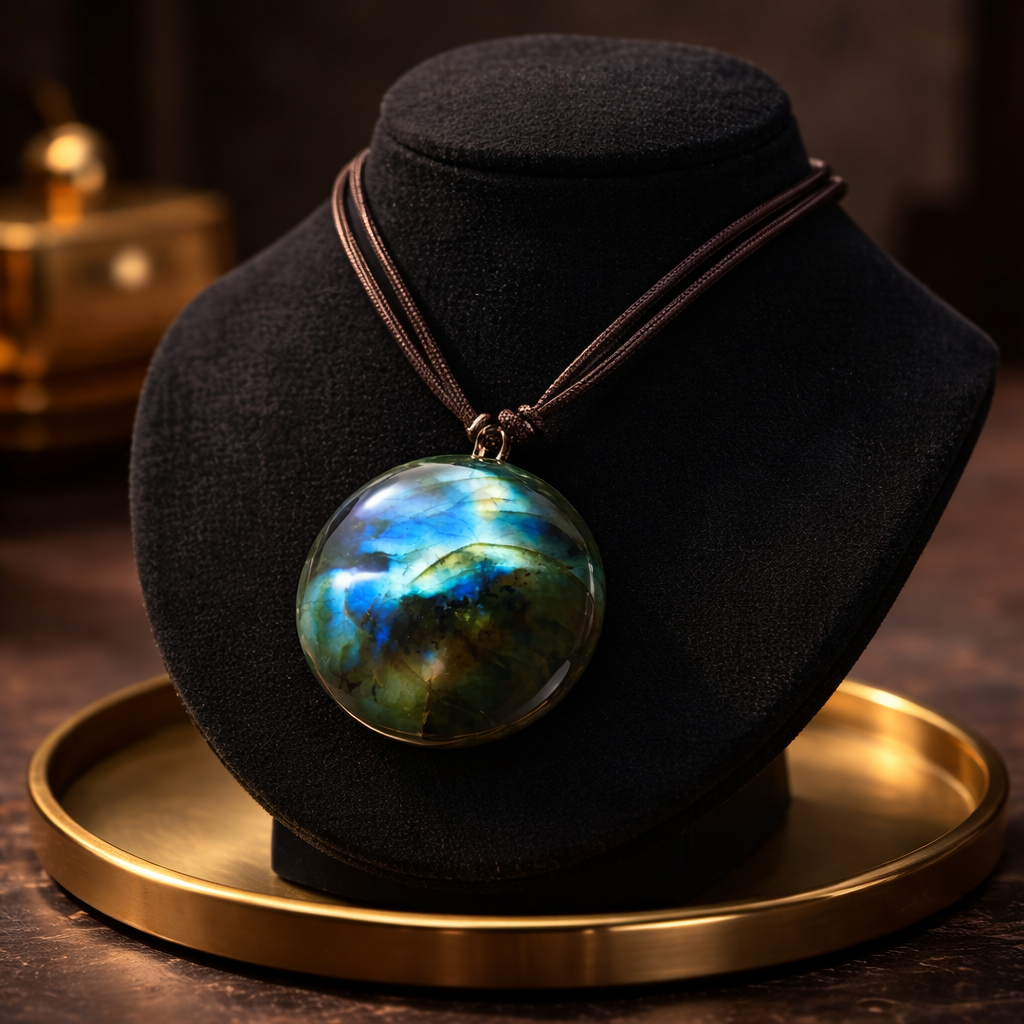 This elegant handmade necklace features a natural labradorite gemstone with a mesmerizing play of blue, green, and golden tones. The smooth, round polished stone gives the necklace a timeless and refined look, making it perfect for both everyday wear and special occasions.