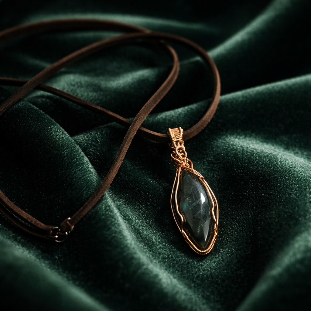 Tämä lumoava labradoriittiriipus hehkuu vihreän ja sinisen mystisissä sävyissä. Kiven sisäinen valo – labradoriitin kuuluisa välke – paljastuu jokaisessa liikkeessä.