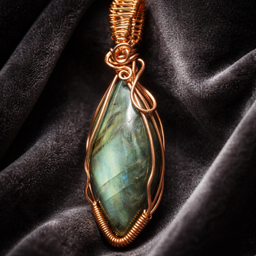 Kuparilangalla muotoiltu kehys korostaa kiven luonnollista kauneutta ja antaa korulle lämpimän, maanläheisen energian. Labradoriittia pidetään intuition, suojan ja sisäisen voiman kivenä.