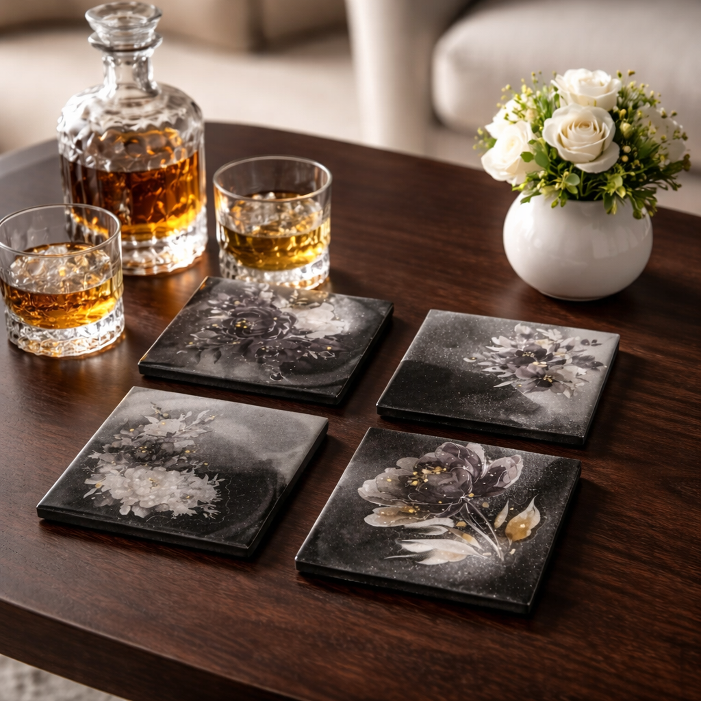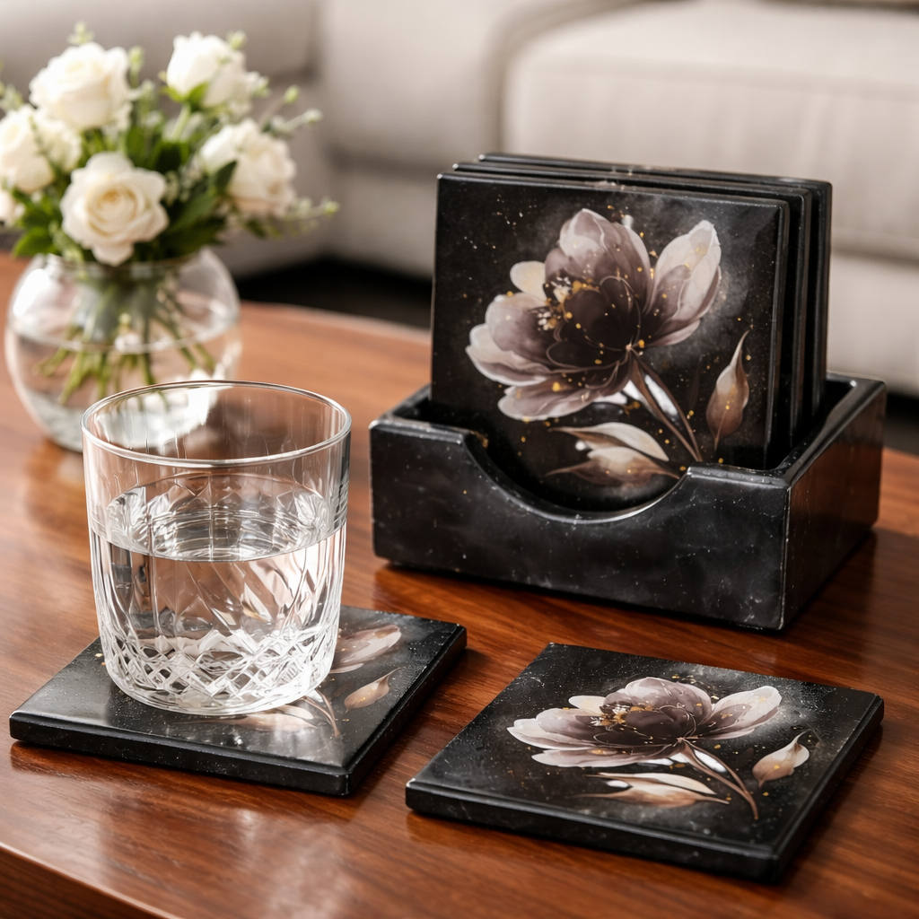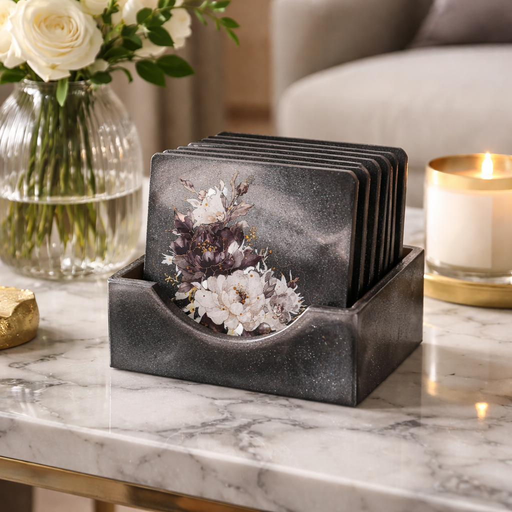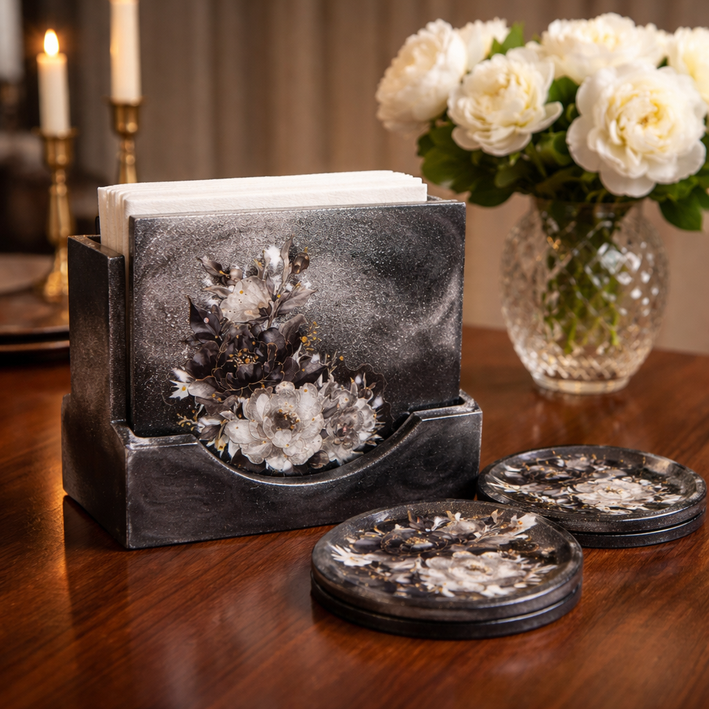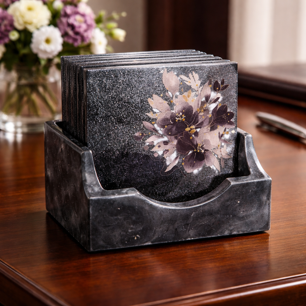Tyylikäs lasinalussetti, jossa mukana käytännöllinen säilytysrasia, yhdistää kauniin muotoilun ja arjen toimivuuden. Tummalla pohjalla oleva hienostunut kukkakuvio tuo kattaukseen eleganssia ja suojaa pöytäpintoja naarmuilta ja kosteudelta.