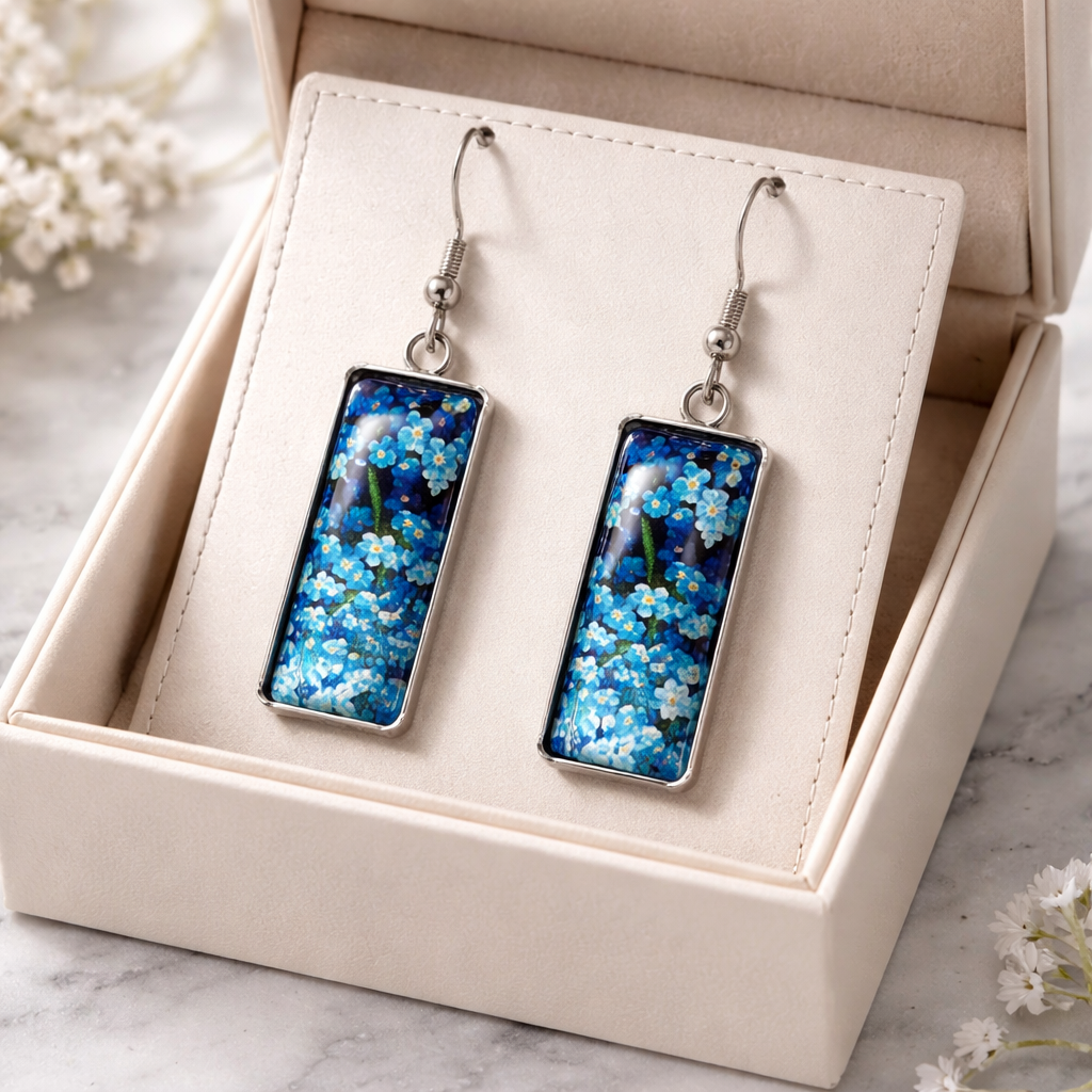 Elegant floral earrings featuring a vibrant blue design protected under a glossy glass surface. Made with stainless steel – durable, comfortable, and perfect for everyday wear.