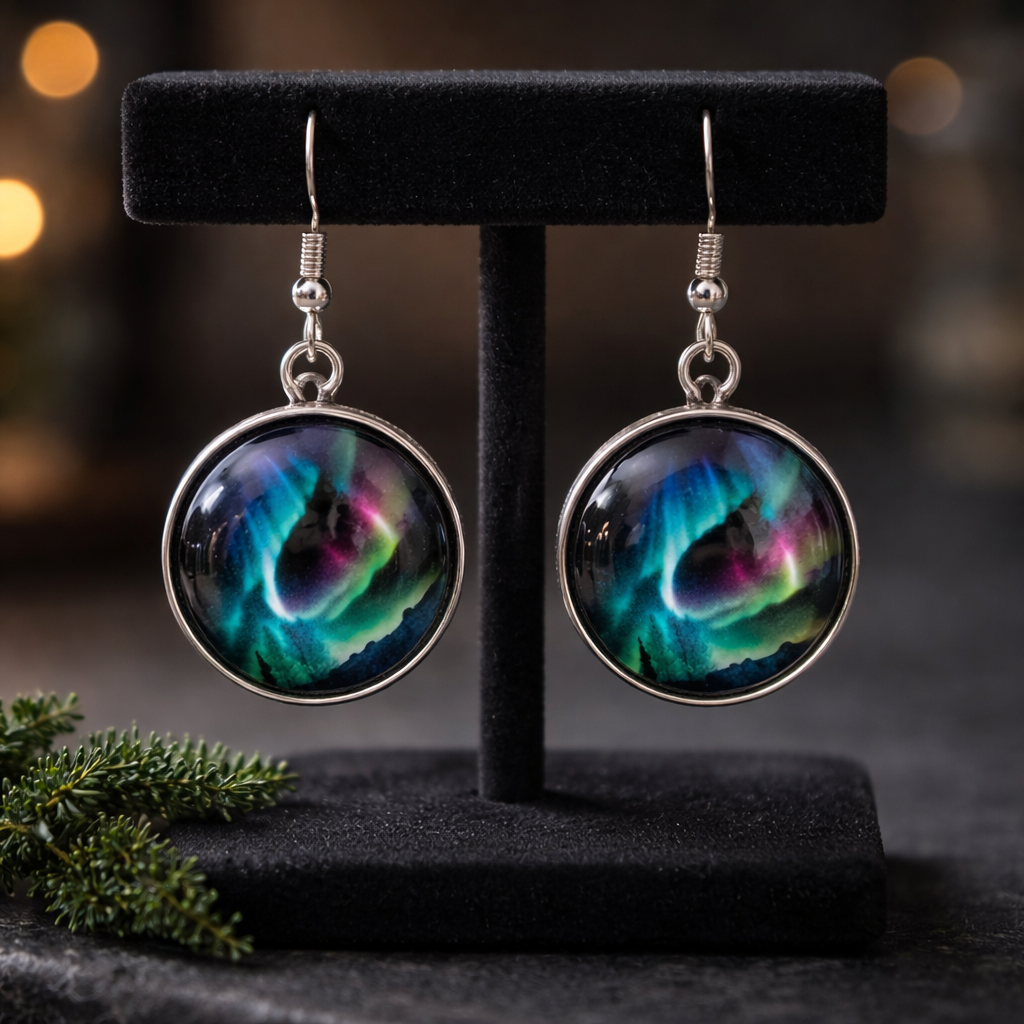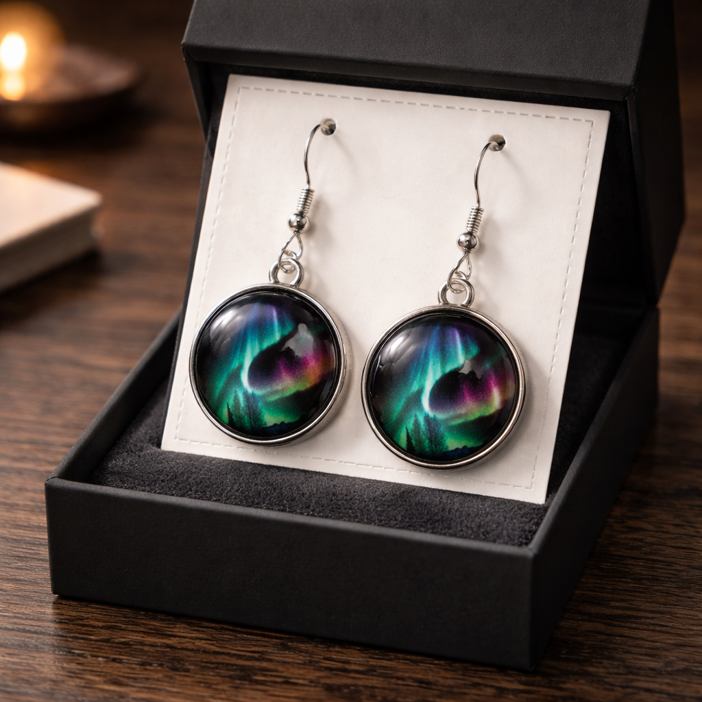 The design captures the atmosphere of Lapland’s winter landscape under the glowing aurora, making these earrings a unique and enchanting accessory.