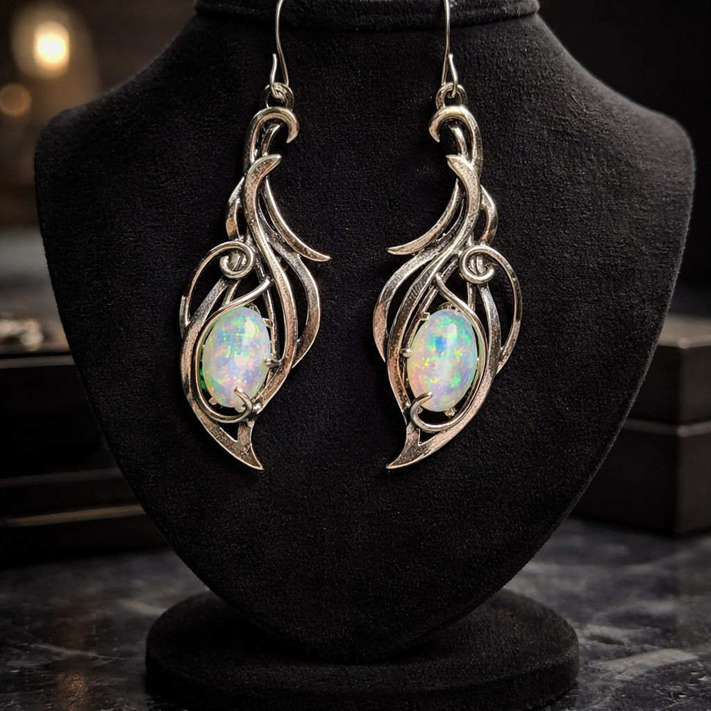 These elegant earrings combine a beautifully ornate metal design with a shimmering synthetic opal, reflecting light in mesmerizing colors. The opal’s play of color creates a mystical and enchanting appearance.
