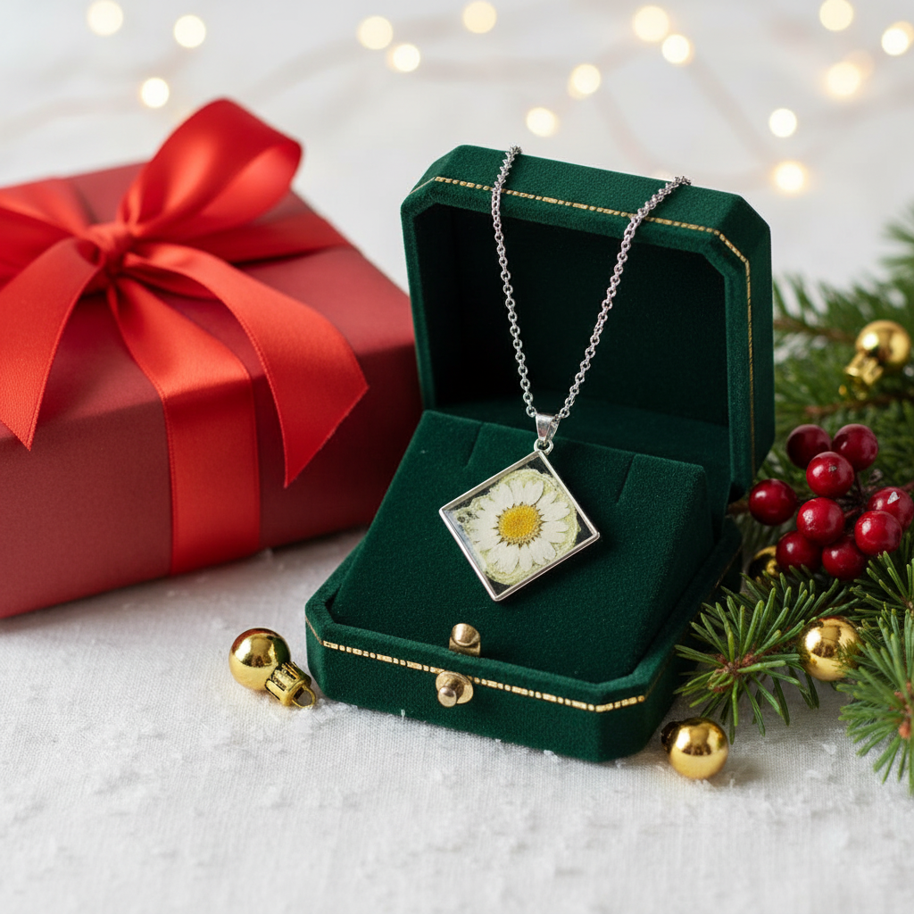 Herkkä käsintehty kaulakoru, jossa on aito kuivattu päivänkakkara kirkkaassa epoksihartsissa.