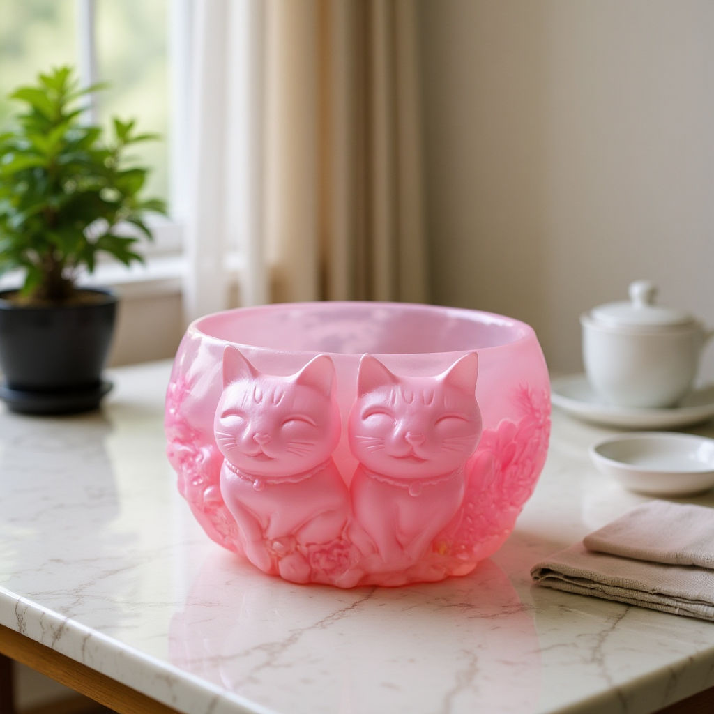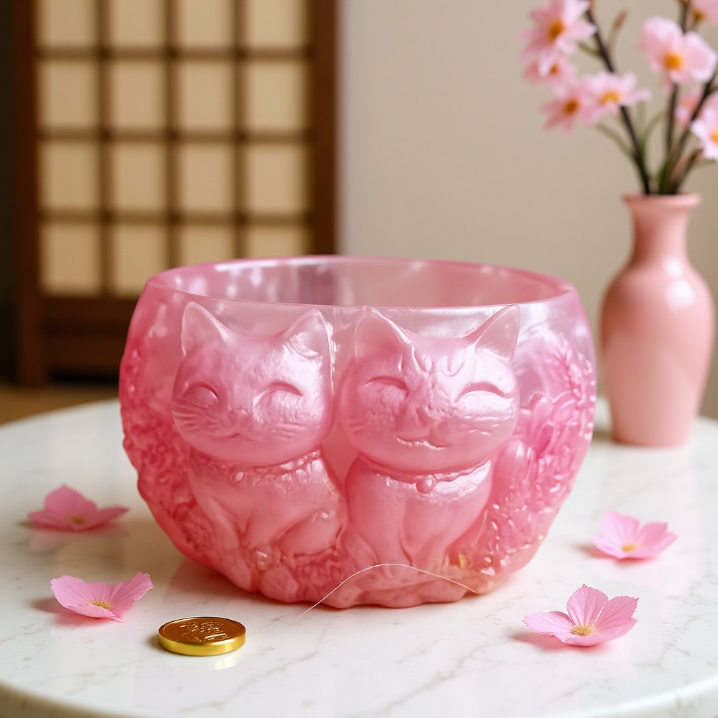 Sievä käsintehty hartsikulho, jota koristavat kaksi suloista onnenkissaa.