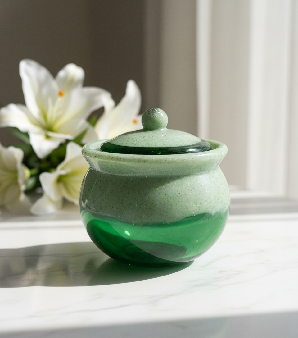 Kaunis käsintehty epixid-hartsi purkki kannella, jossa on upea vihreiden ja kermaisen sävyjen liukuväri sekä hienovaraisia kultaisia yksityiskohtia. Sopii täydellisesti sisustuselementiksi, korujen säilytykseen tai pienten muistoesineiden purkiksi. Tyylikäs ja romanttinen ulkonäkö tekee siitä ihanan lahjan tai kodin koristeen.