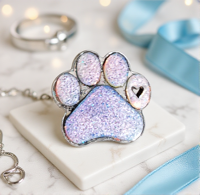Suloinen käsintehty hartsiriipus, tassunjäljen muodossa ja pienellä sydänyksityiskohdalla.