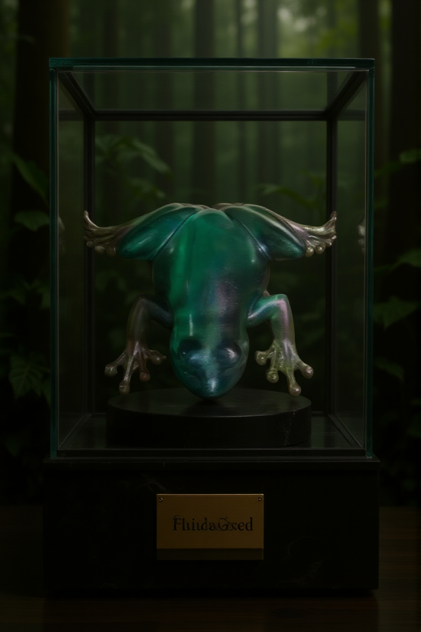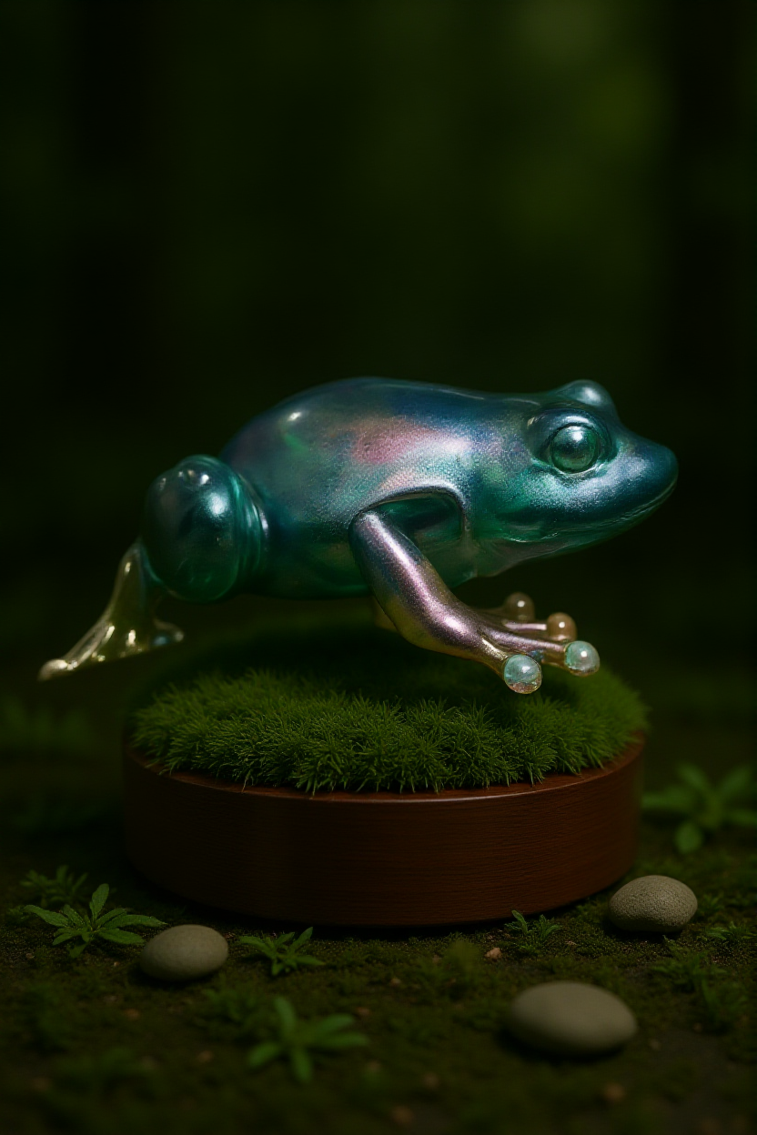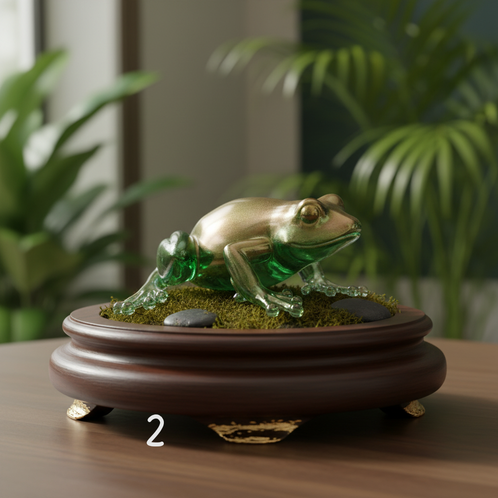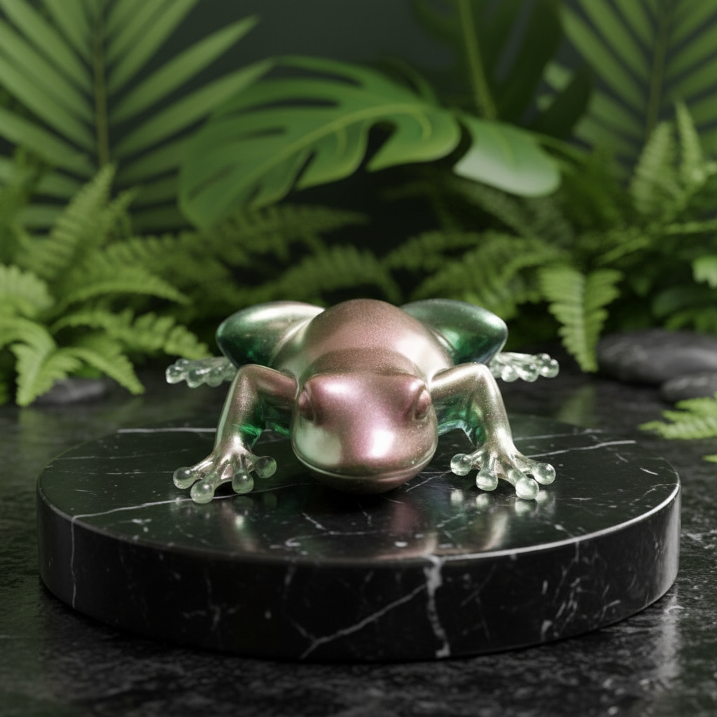 Kauniisti valmistettu koristeellinen sammakkofiguuri, jossa on vihreän ja kullan hohtava pinta.