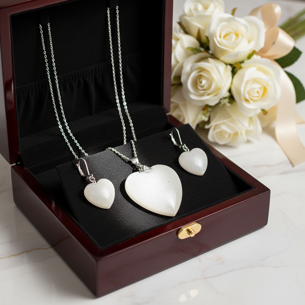 Tyylikäs käsintehty korusetti, joka koostuu sydämenmuotoisesta riipuksesta ja yhteensopivista korvakoruista. Korut on valmistettu laadukkaasta epoksihartsista ja viimeistelty 925-hopealla. Hillitty helmiäishohto tekee setistä ajattoman ja elegantin – täydellinen lahja tai kaunis lisä arkeen ja juhlaan.