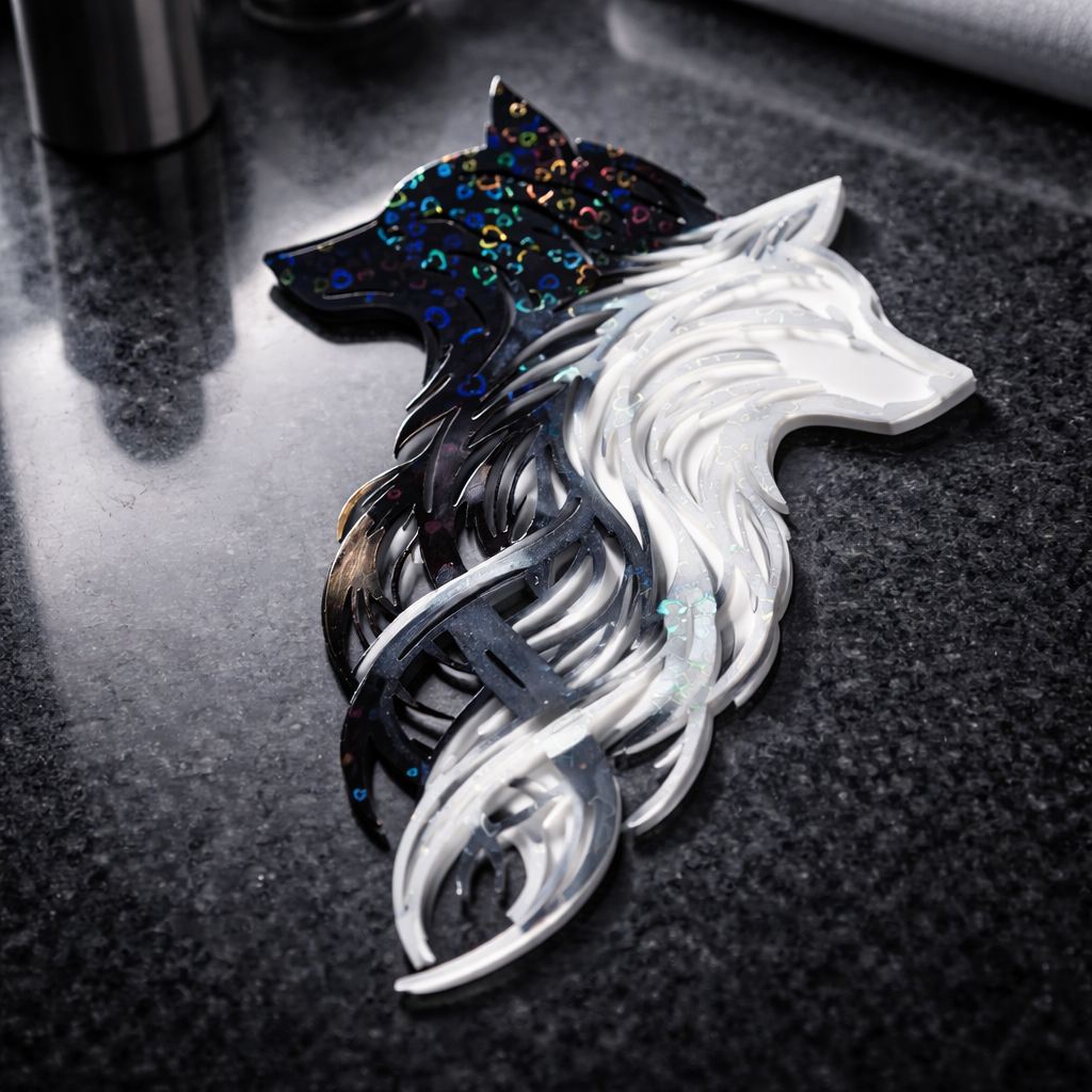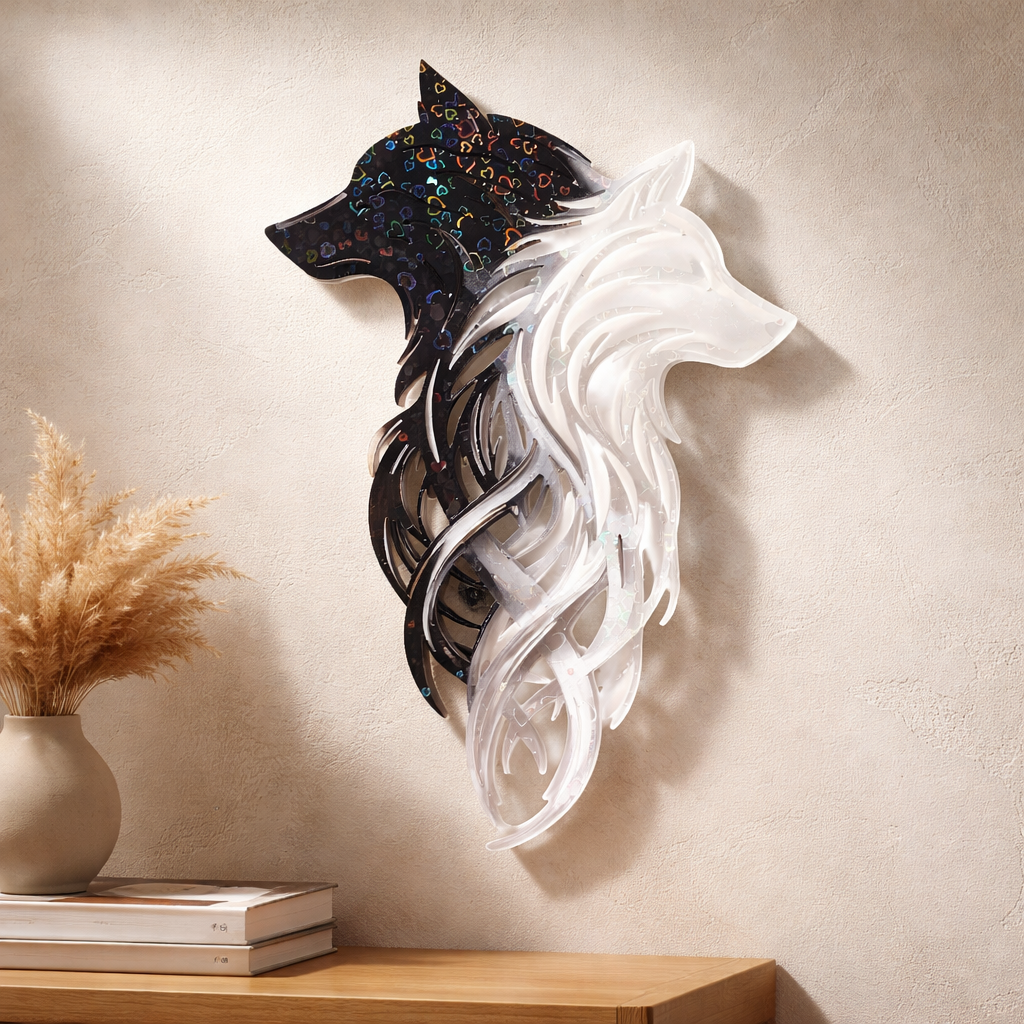 Tyylikäs ja moderni seinäkoriste, jossa kaksi toisiaan täydentävää sutta yhdistyvät yhdeksi taideteokseksi. Mustan ja valkoisen kontrasti sekä holografiset yksityiskohdat luovat voimakkaan ja mystisen ilmeen. Koriste sopii täydellisesti olohuoneeseen, makuuhuoneeseen tai työtilaan tuomaan syvyyttä ja ainutlaatuista persoonallisuutta. Kevyt ja helppo kiinnittää seinälle.