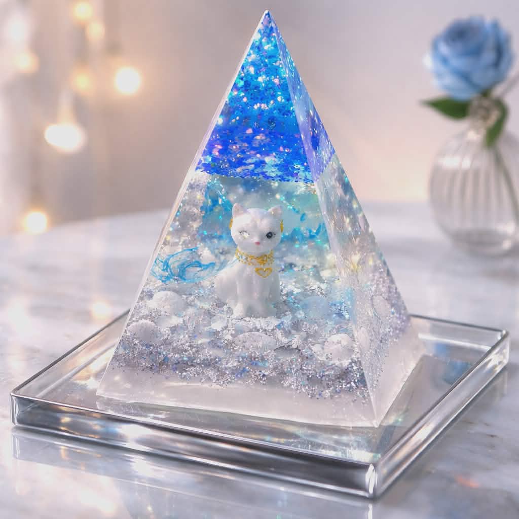 Tämä talvihenkinen energiapyramidi yhdistää kirkkaan läpinäkyvän muodon, viileät siniset sävyt ja hienostuneen kimalluksen. Sisällä oleva koristeellinen yksityiskohta luo satumaisen vaikutelman. Täydellinen sisustukseen, juhlapöytään, talvikauden koristeluun tai lahjaksi henkilölle, joka rakastaa eleganttia ja harmonista designia. Ajaton ja näyttävä sisustusesine moderniin kotiin.