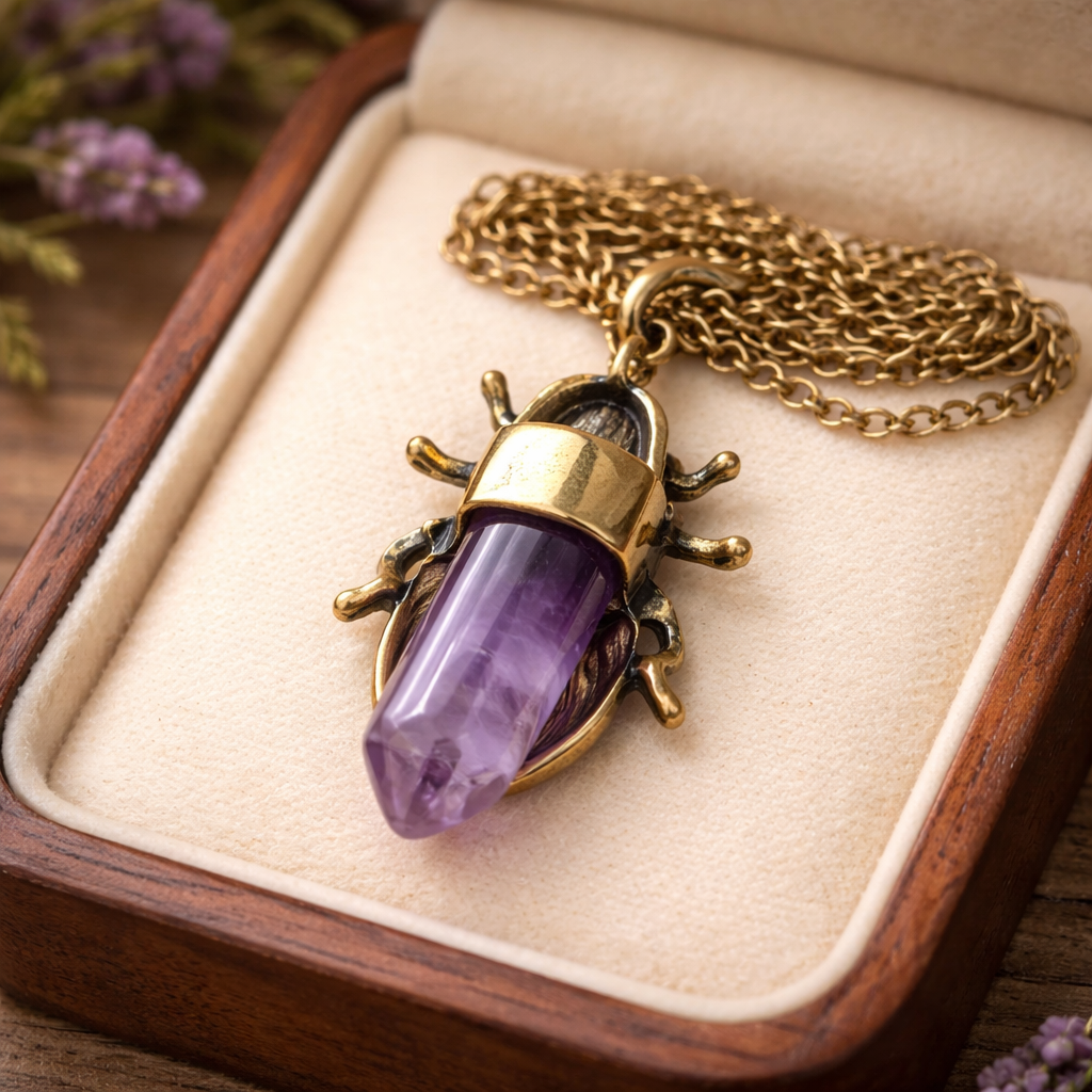 Tyylikäs violetti kristallikaulakoru hyönteismuotoisella riipuksella ja kultaketjulla. Valmis koru lahjaksi tai arkeen – näyttävä ja elegantti.