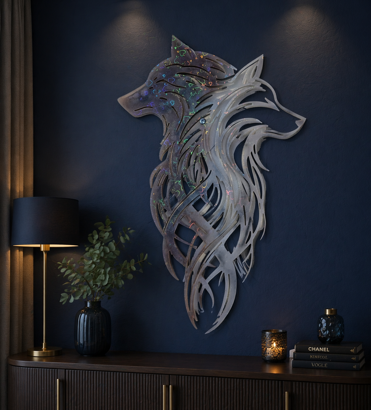 Koristeellinen susi – käsintehty epoksitaide seinälle | Uniikki sisustus